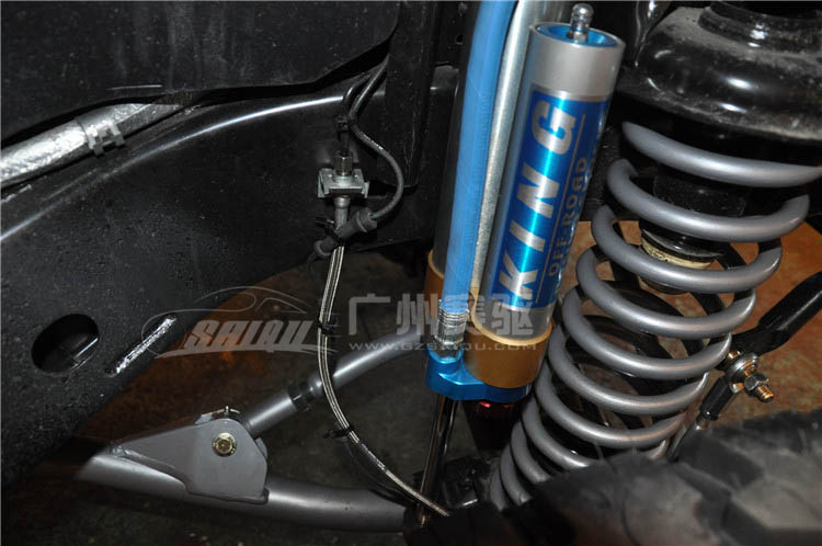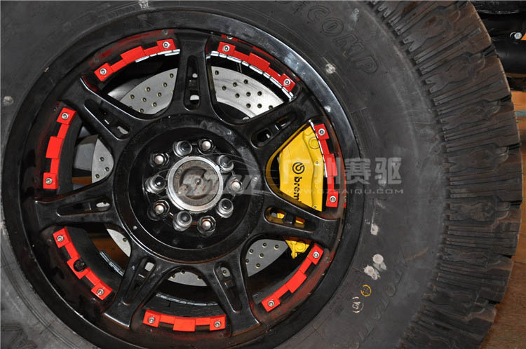 剎車改裝升級方案:升級原廠剎車系統,前面配置意大利原裝進口的brembo六活塞剎車卡鉗,355mm*32mm的分體打孔劃線碟,后輪配置意大利原裝進口brembo小四活塞剎車卡鉗,300mm*24mm的分體打孔剎車碟。