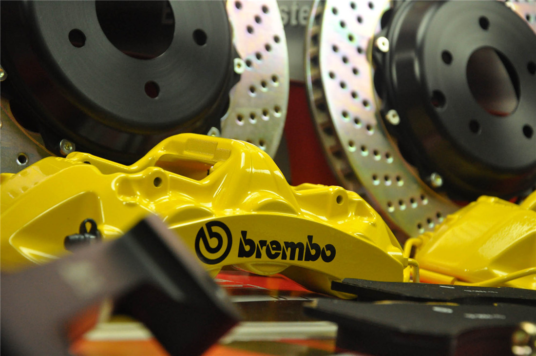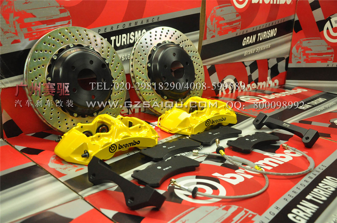 Brembo GT系列的制動套裝,其中卡鉗本體為對向6活塞一體鍛造卡鉗,全浮動散熱剎車碟盤具有方向性之導風道以達最佳之冷卻效能,并且由于特殊劃線設計有效達到增加磨擦 力,持續清潔剎車盤并確保來剎車片與剎車盤之最佳磨擦咬合面。